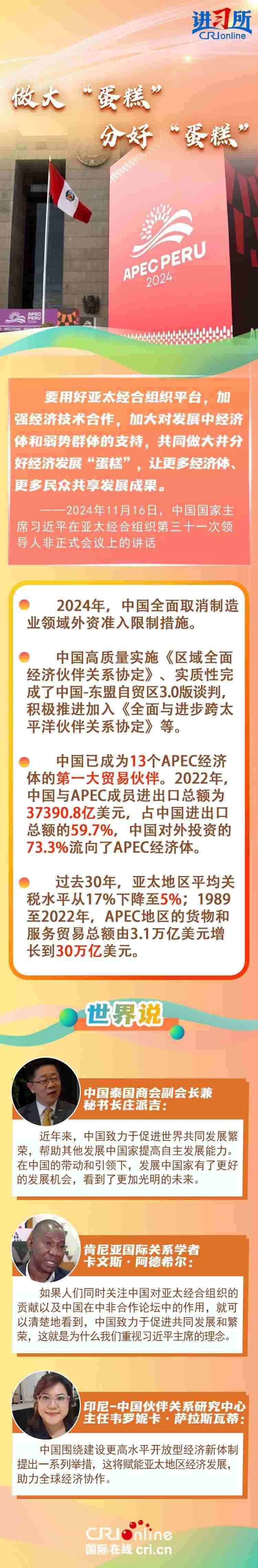 自1991年加入APEC以來(lái),中國(guó)作為關(guān)鍵一員,持續(xù)為亞太地區(qū)成為世界經(jīng)濟(jì)的“火車頭”輸出關(guān)鍵穩(wěn)定力量,習(xí)近平主席表示,“落其實(shí)者思其樹(shù),飲其流者懷其源”。中國(guó)的發(fā)展離不開(kāi)亞太,也將進(jìn)一步造福亞太。多國(guó)人士表示,在中國(guó)的帶動(dòng)和引領(lǐng)下,發(fā)展中國(guó)家有了更好的發(fā)展機(jī)會(huì),看到了更加光明的未來(lái)。