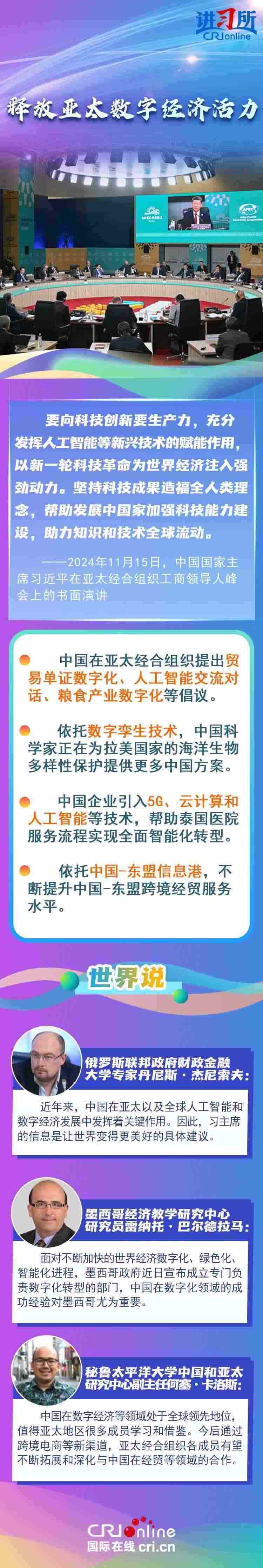 亞太之大,容得下大家共同發(fā)展。當(dāng)前單邊主義、保護(hù)主義蔓延,世界經(jīng)濟(jì)正經(jīng)受逆水行舟、不進(jìn)則退的嚴(yán)峻考驗(yàn)。習(xí)近平主席從促進(jìn)亞太合作大局出發(fā),圍繞“綠色”“創(chuàng)新”“普惠包容”等議題,闡釋中國(guó)行動(dòng),強(qiáng)調(diào)要守正創(chuàng)新,擦亮開(kāi)放亞太、包容亞太的金字招牌,打造綠色亞太、數(shù)字亞太的新招牌,推動(dòng)構(gòu)建亞太命運(yùn)共同體。