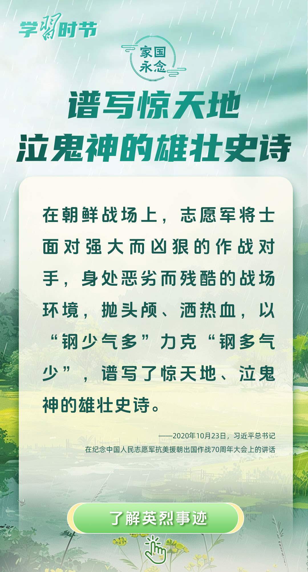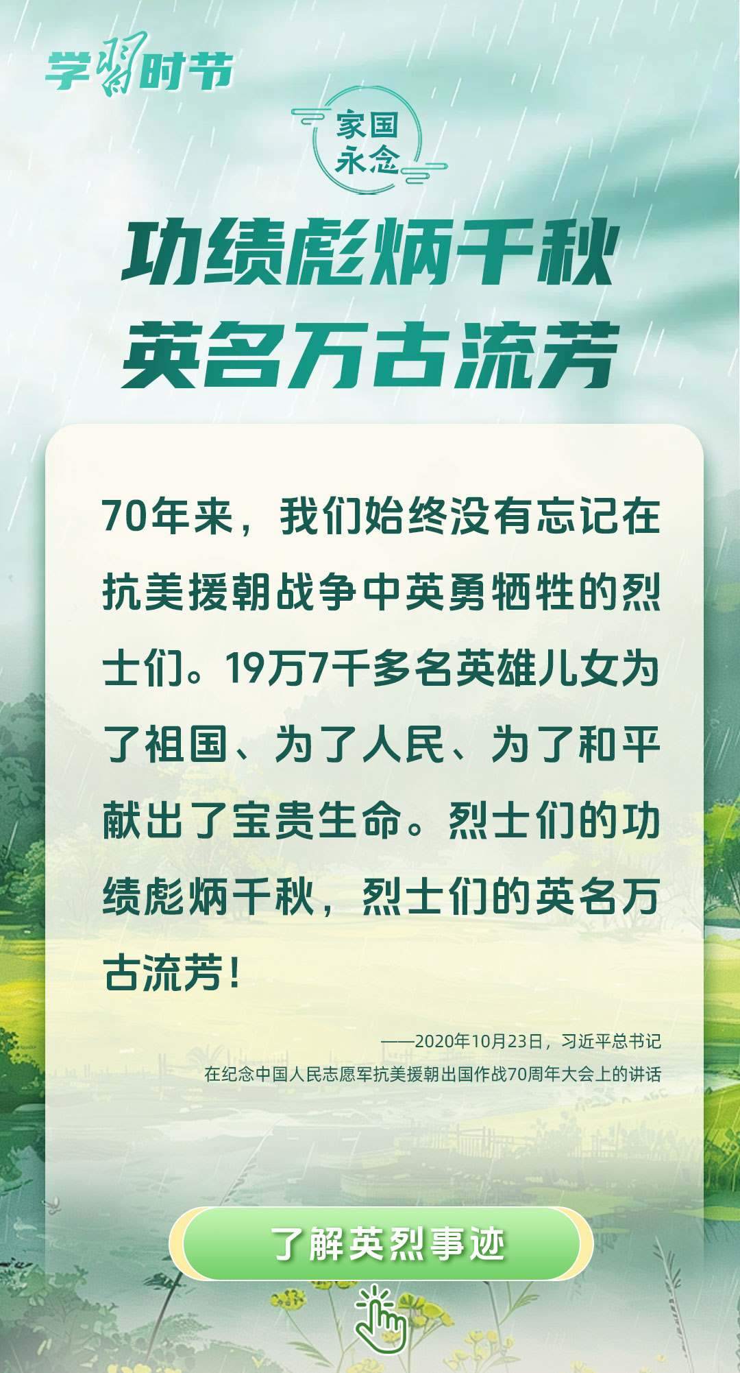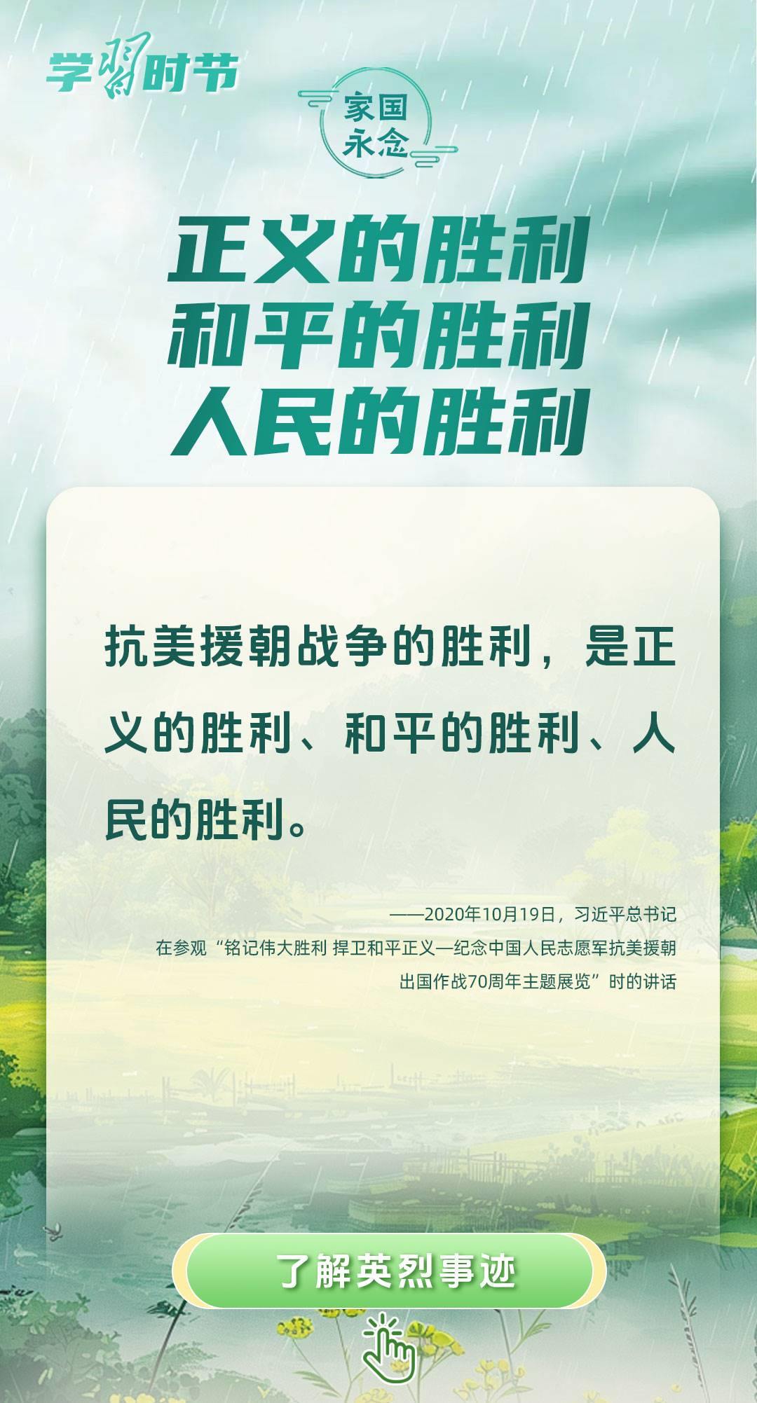 今年是中國(guó)人民抗日戰(zhàn)爭(zhēng)暨世界反法西斯戰(zhàn)爭(zhēng)勝利80周年、中國(guó)人民志愿軍抗美援朝出國(guó)作戰(zhàn)75周年。習(xí)近平總書(shū)記曾說(shuō):“對(duì)一切為國(guó)家、為民族、為和平付出寶貴生命的人們,不管時(shí)代怎樣變化,我們都要永遠(yuǎn)銘記他們的犧牲和奉獻(xiàn)?!苯裉煳覀兯鶕碛械囊磺校瑹o(wú)不凝結(jié)著英雄、英烈們的奉獻(xiàn)付出乃至巨大犧牲。