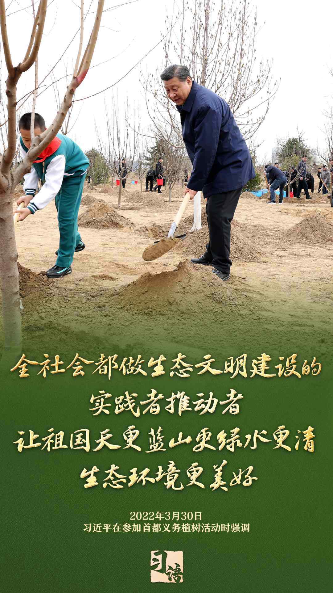 “植樹造林是一件很有意義的事情,是一項功在當代、利在千秋的崇高事業(yè),要一以貫之、持續(xù)做下去?!弊?013年以來的13個春天里,無論晴雨,習近平總書記都會拿起鐵鍬,與干部群眾一起參加首都義務植樹活動。鏟土造坑、培土圍堰、提水澆灌,總書記身體力行種下綠色的希望,對擴綠興綠護綠、建設美麗中國提出明確要求。一起學習。