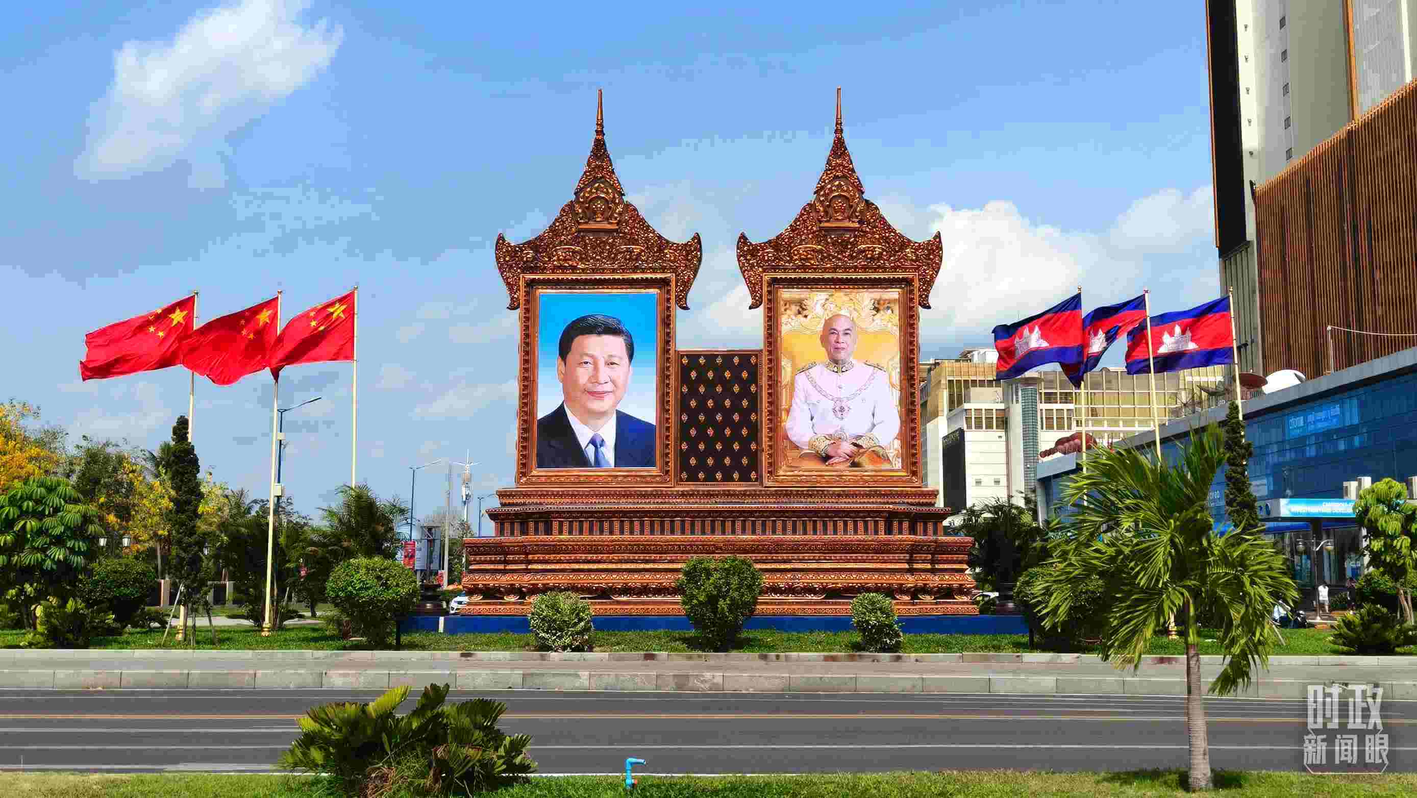 △金邊街頭的巨幅中柬兩國(guó)領(lǐng)導(dǎo)人照片和國(guó)旗。(總臺(tái)央視記者陸泓宇拍攝)