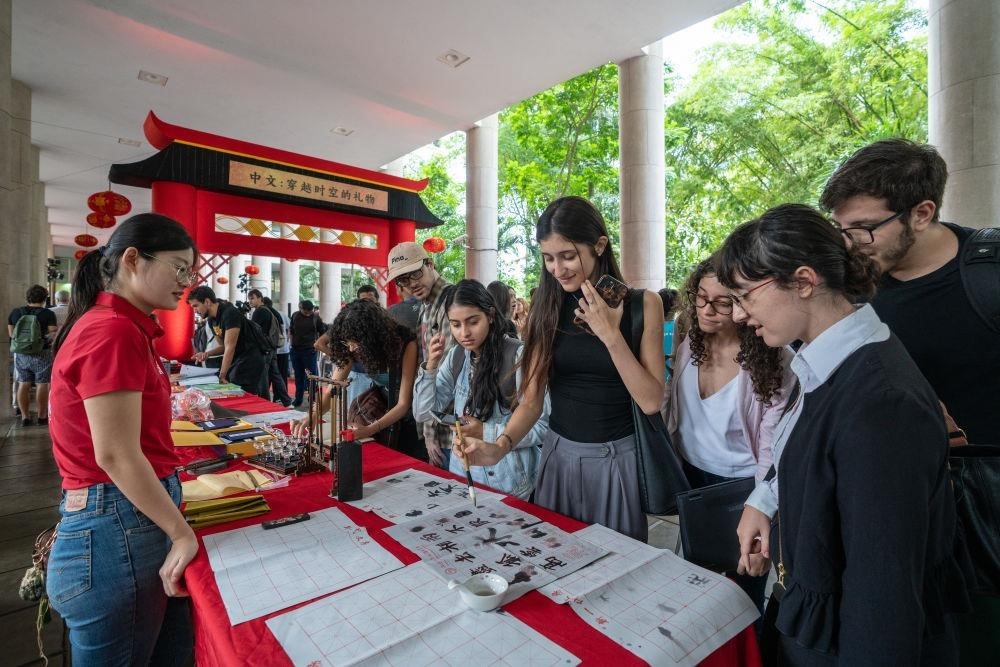 △2025年4月,在巴西里約熱內(nèi)盧天主教大學(xué)舉辦的“國(guó)際中文日”慶?;顒?dòng)上,學(xué)生們體驗(yàn)中文書法。
