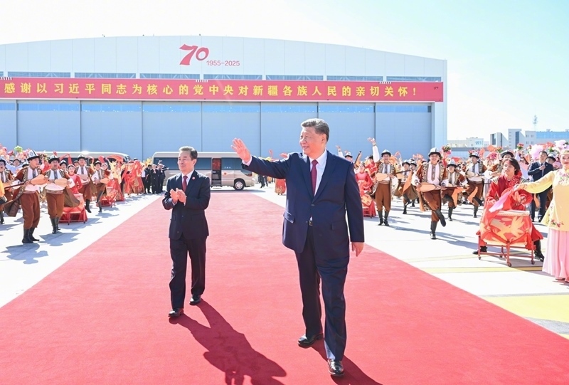 25日中午,習(xí)近平總書記在烏魯木齊出席新疆維吾爾自治區(qū)成立70周年慶?;顒雍?,乘專機返回北京。在烏魯木齊市區(qū)和機場,新疆各族群眾熱情歡送總書記。(文字記者:張曉松、朱基釵;攝影記者:謝環(huán)馳、申宏、李琰)