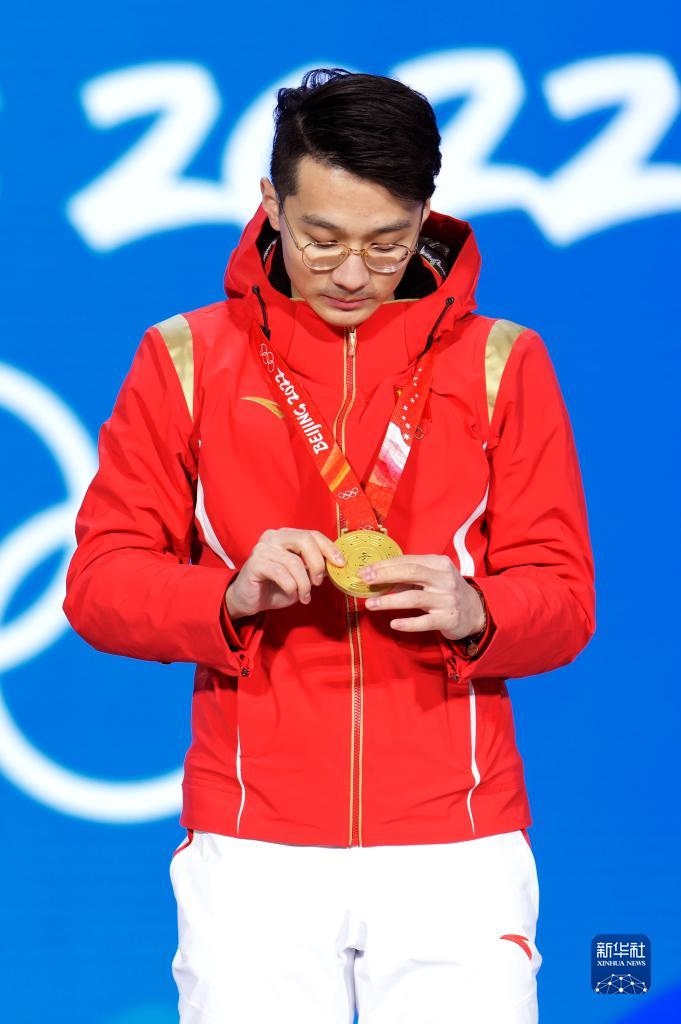 2月8日,冠軍中國隊(duì)選手任子威在獎(jiǎng)牌頒發(fā)儀式上。