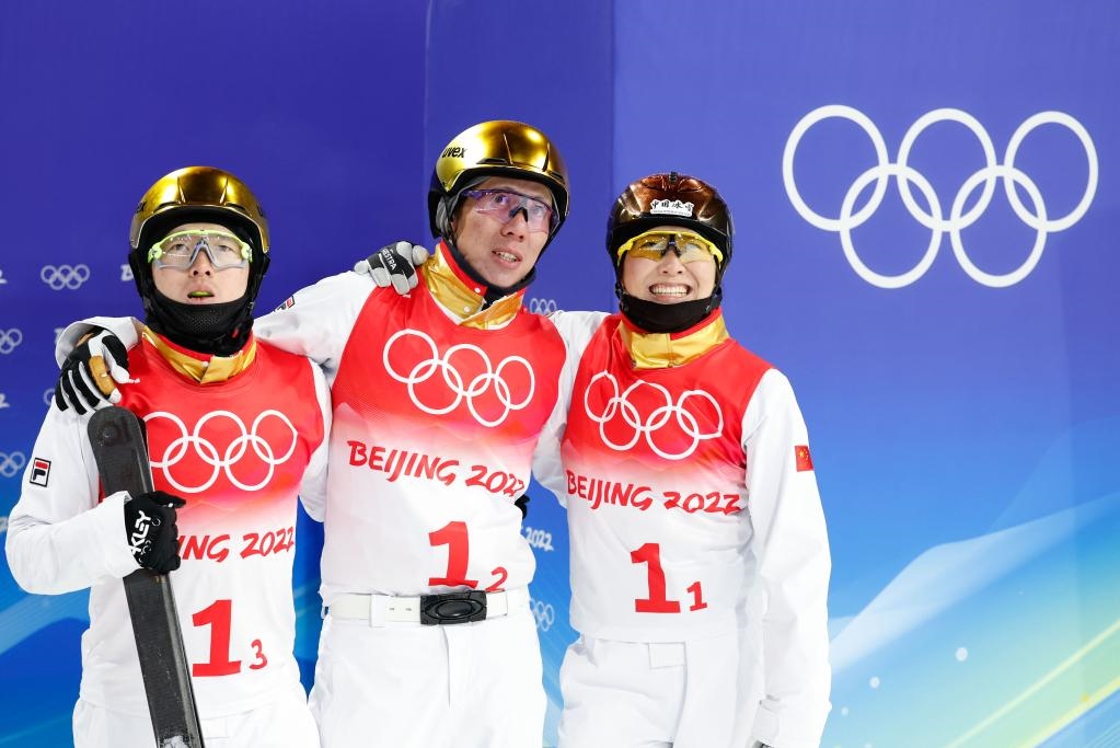 2月10日,中國隊(duì)選手賈宗洋(中)、徐夢桃(右)和齊廣璞(左)在自由式滑雪空中技巧混合團(tuán)體比賽后等待成績公布。新華社記者費(fèi)茂華攝
