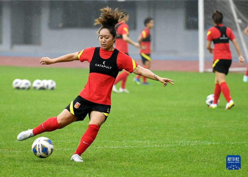 7月12日,唐佳麗(前)在訓(xùn)練中射門。新華社記者 李紫恒 攝