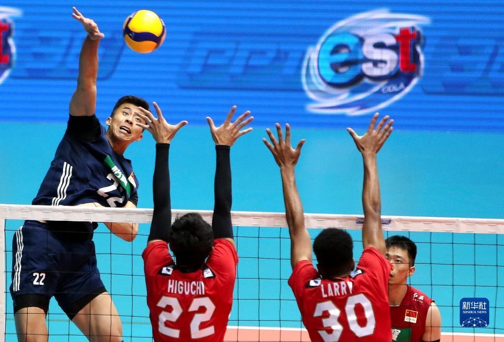 8月14日,中國隊球員張景胤(右一)在比賽中扣球。新華社記者 王騰 攝