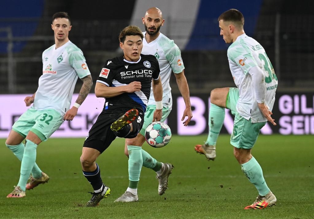 2021年3月10日,當(dāng)時(shí)效力于比勒菲爾德隊(duì)的日本球員堂安律(前左)在德甲比賽中帶球突破。他現(xiàn)在效力于德甲弗賴堡俱樂部。新華社發(fā)(烏爾里希·胡夫納格爾 攝)