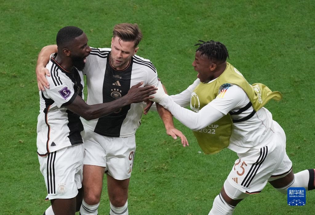11月27日,德國隊球員尼克拉斯·菲爾克魯格(左)在比賽中進(jìn)球后與隊友慶祝。新華社記者 潘昱龍 攝
