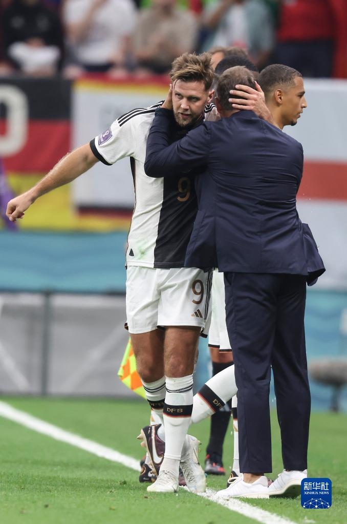 11月27日,德國隊球員尼克拉斯·菲爾克魯格(左)在比賽中進(jìn)球后與主教練漢斯·弗利克慶祝。新華社記者 曹燦 攝