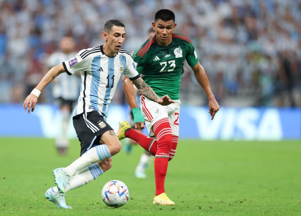 11月26日,阿根廷隊(duì)球員迪瑪利亞(左)在對(duì)陣墨西哥隊(duì)的比賽中突破。新華社記者 潘昱龍 攝