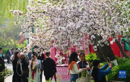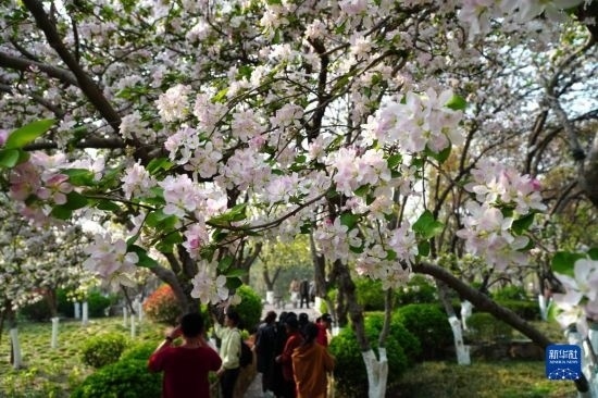 3月21日,在濟南市五龍?zhí)豆珗@,人們在觀賞盛開的海棠花。