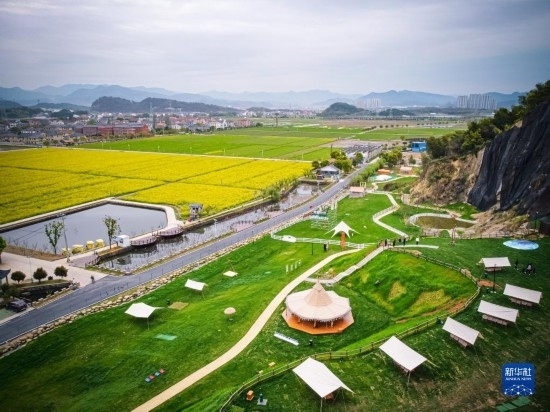 這是3月29日拍攝的諸暨市楓橋鎮(zhèn)杜黃新村用廢棄礦山改造的露營旅游地(無人機(jī)照片)。