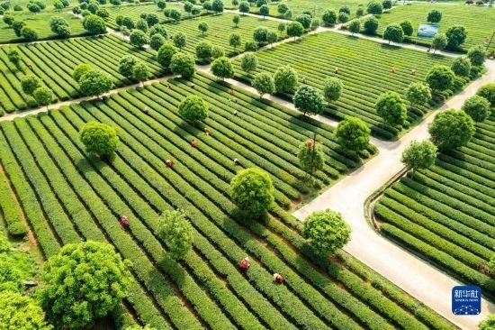 4月11日,在長沙望城烏山貢茶基地,茶農(nóng)采摘春茶(無人機(jī)照片)。