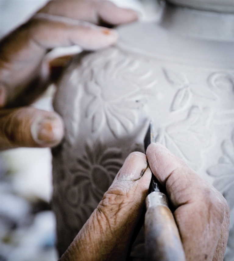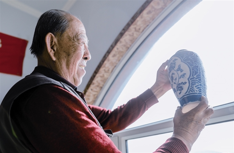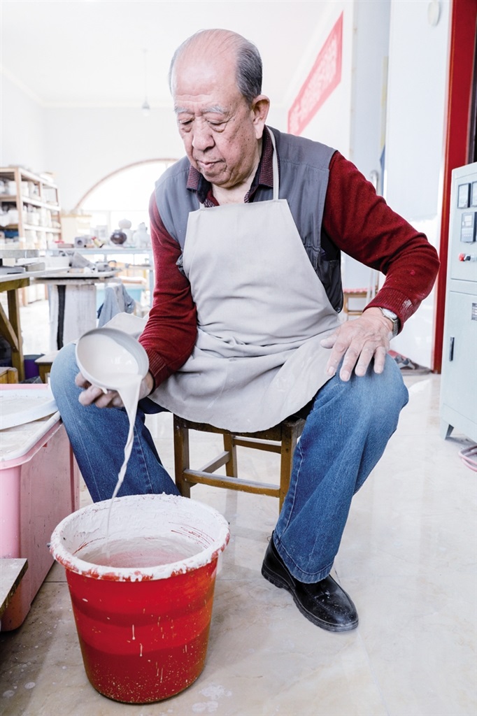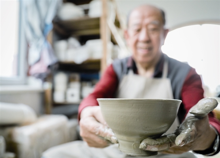 隨后,他走進“饅頭窯”旁邊的一口窯洞,這是當時張家的一間手工作坊,揉泥、拉坯、上釉等一系列制作陶瓷的工序都是在這里完成?!拔揖统錾谶@個村子,已經(jīng)是張家瓷藝的第九代傳人了。作為中國磁州窯譜系,清水河黑礬溝瓷藝生產(chǎn)歷史至少已有800年?!标P(guān)于這項非遺的歷史故事,張選老人向記者娓娓道來:大約400年前,他們張家走西口從山西來到清水河謀生,當時清水河黑礬溝有一家姓杜的人家做陶瓷營生,張家的先人在杜家打工,大概這樣打工做了三輩人吧,杜家忽然不做了,搬離了黑礬溝,他們張家便把杜家的產(chǎn)業(yè)買了下來繼續(xù)做。“那個時候黑礬溝生產(chǎn)的瓷器都與人們生活息息相關(guān),比如腌菜缸、水甕、碗盤等,一個家庭手工作坊一天能生產(chǎn)500個碗呢,生意很好,人們靠做這個營生也過上了不錯的生活?!睆堖x回憶著清水河瓷藝鼎盛時期的場景。上個世紀70年代,由于交通、技術(shù)等原因,黑礬溝燃燒了幾百年的窯火熄滅,傳統(tǒng)“饅頭窯”被正式廢棄,轉(zhuǎn)移到窯溝鄉(xiāng)后手工作坊變成了機械化生產(chǎn),這也讓清水河的陶瓷名聲大噪。當時,在窯溝鄉(xiāng)一帶,從事陶瓷生產(chǎn)的有近萬人,陶瓷業(yè)成為清水河支柱產(chǎn)業(yè)。