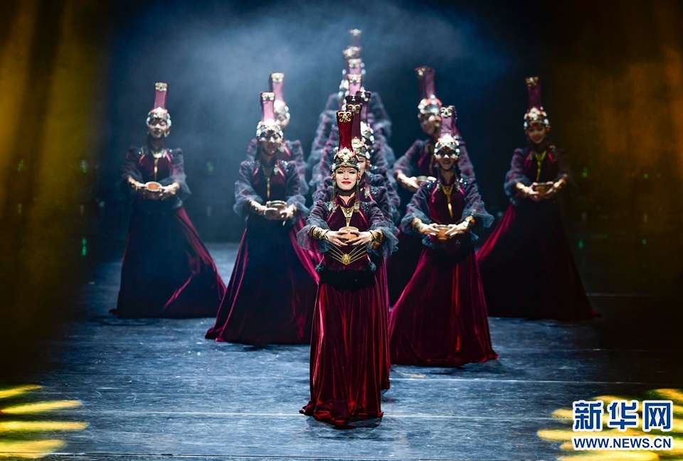 1月12日,演員在2022年內(nèi)蒙古新年舞蹈晚會中表演群舞《盅舞》。新華網(wǎng)發(fā)(王正攝)