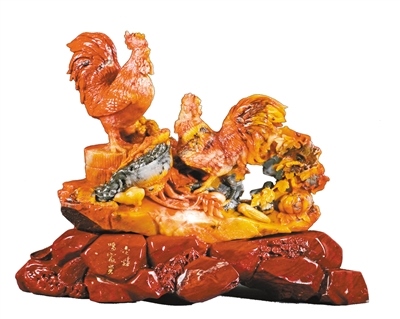 巴林石雕“金雞鳴富貴”?! ?/p>