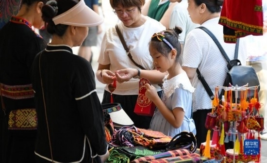7月8日,游客在五指山三月三廣場選購黎族特色產品。