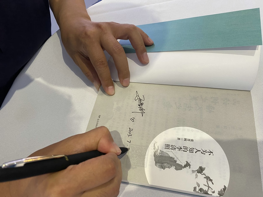 圍繞某些宋人作品中記載的李清照“流落以死”、李清照卒年的多版本說(shuō)法、李清照的詩(shī)詞風(fēng)格為什么會(huì)從婉約轉(zhuǎn)變到豪放等“疑點(diǎn)”,張晉閣先生為大家講述了《不為人知的李清照》的寫(xiě)作緣由、研究經(jīng)歷、文字表達(dá)形式和內(nèi)心希冀。隨后,兩位讀者分別提出“您最喜歡李清照的哪一首詩(shī)詞”、“對(duì)李清照的寫(xiě)作產(chǎn)生深遠(yuǎn)影響的人是誰(shuí)”這兩個(gè)問(wèn)題,張晉閣先生分享了自己的看法并朗誦了優(yōu)美的詩(shī)詞佳作,現(xiàn)場(chǎng)交流、互動(dòng)氣氛熱烈?;顒?dòng)結(jié)束后,張晉閣先生為讀者朋友們簽名留念。多位年輕讀者表示,通過(guò)閱讀《不為人知的李清照》,加深了他們對(duì)古典詩(shī)詞的喜愛(ài)。