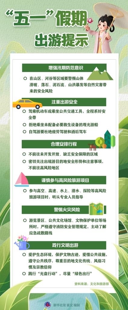 文化和旅游部近日發(fā)布“五一”假期出游提示,提醒廣大游客增強(qiáng)汛期防范意識(shí)、注重出游安全、合理安排行程、謹(jǐn)慎參與高風(fēng)險(xiǎn)旅游項(xiàng)目、警惕火災(zāi)風(fēng)險(xiǎn)、踐行文明出游。