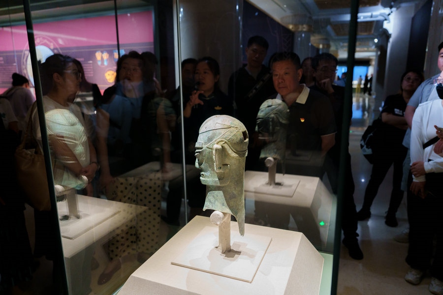 來自四川廣漢三星堆遺址出土的文物引人關(guān)注,三星堆展品共5件,銅人頭像、銅人面具、銅頂尊跪坐人像肩部龍形裝飾、銅跪坐人像4件真品,銅縱目面具1件復(fù)制品。