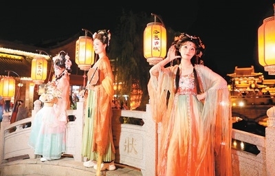 洛邑古城相關(guān)負責人介紹,景區(qū)致力于漢服文化的推廣與傳承,創(chuàng)意打造穿越新場景,豐富文旅新業(yè)態(tài)。景區(qū)有24個朝代的漢服形制、56個民族的服飾款式,游客可找到各自喜歡的款式,扮演喜愛的角色。燈獅畫橋、香羅幔天、文峰暮鼓等30余處場景,讓游客盡享“穿越自由”。洛邑古城還策劃了一系列創(chuàng)新主題活動,讓身著漢服的游客與“李白”“武則天”談古論今,與“嫦娥”“牡丹花神”近距離互動。