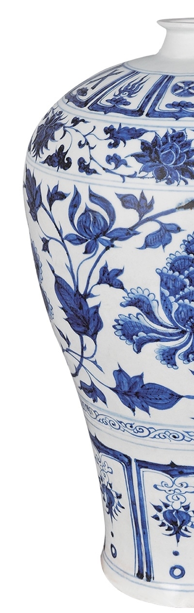 “元代的景德鎮(zhèn)制瓷匠從波斯進(jìn)口‘蘇麻離青’,也就是鈷藍(lán)料,經(jīng)高溫?zé)坪蟪尸F(xiàn)出了青花的典型色調(diào)?!别^長(zhǎng)彭國(guó)紅靠近展柜,指著梅瓶說(shuō)道:“青花料濃厚處有黑褐色鐵銹瑕疵,是因?yàn)檫@種原料中含有金屬元素,這是元代青花制品的特點(diǎn)之一?!?/p>