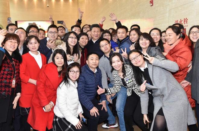 2016年2月19日,習近平到中央新聞單位調(diào)研。圖為習近平與人民日報社人民網(wǎng)員工合影。