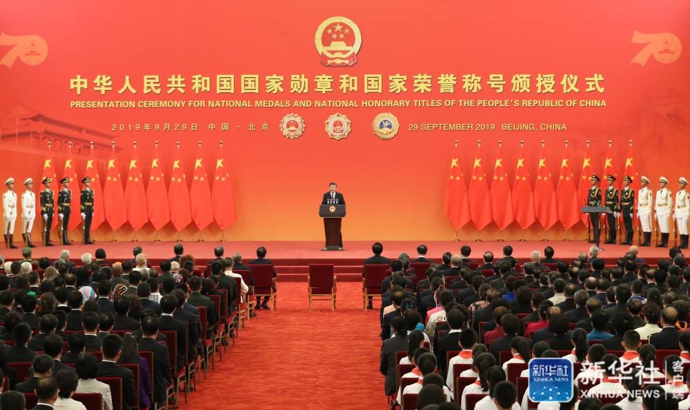 ↑9月29日,中華人民共和國(guó)國(guó)家勛章和國(guó)家榮譽(yù)稱號(hào)頒授儀式在北京人民大會(huì)堂金色大廳隆重舉行。中共中央總書(shū)記、國(guó)家主席、中央軍委主席習(xí)近平向國(guó)家勛章和國(guó)家榮譽(yù)稱號(hào)獲得者頒授勛章獎(jiǎng)?wù)虏l(fā)表重要講話。新華社記者姚大偉攝