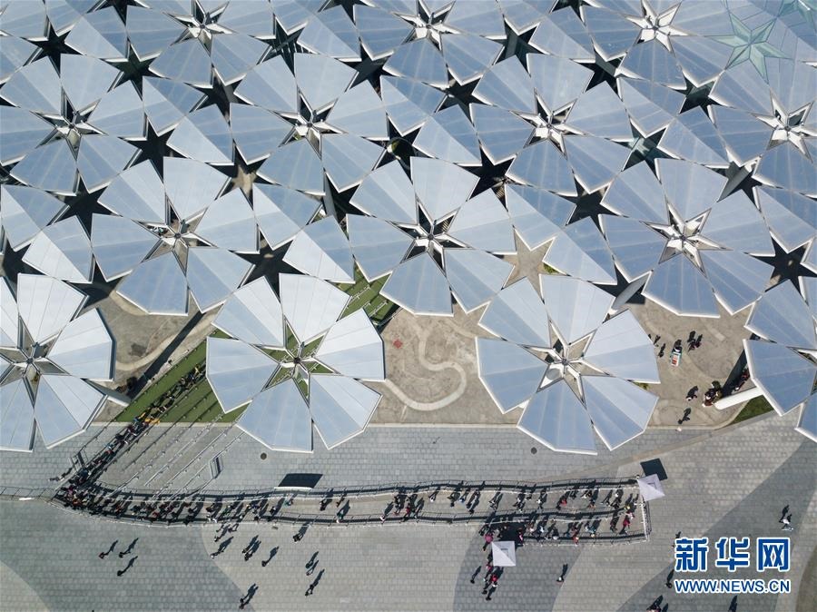 游客在北京世園會國際館前排隊(duì)參觀(10月7日無人機(jī)拍攝)。