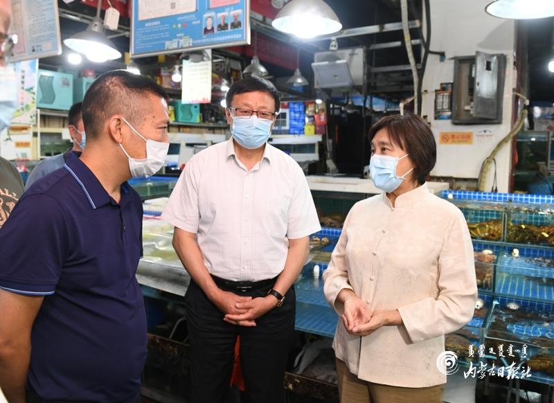 6月22日,自治區(qū)黨委副書(shū)記、自治區(qū)主席、自治區(qū)新冠肺炎疫情防控工作指揮部總指揮布小林,自治區(qū)副主席、自治區(qū)防控工作指揮部副總指揮歐陽(yáng)曉暉來(lái)到位于呼和浩特市賽罕區(qū)的融橋海鮮市場(chǎng),了解海鮮和水產(chǎn)品產(chǎn)地、物流運(yùn)輸、銷量變化等情況。內(nèi)蒙古日?qǐng)?bào)社融媒體記者 韓卿立 攝