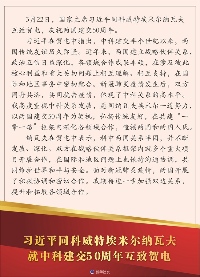 新華社北京3月22日電 3月22日,國(guó)家主席習(xí)近平同科威特埃米爾納瓦夫互致賀電,慶祝兩國(guó)建交50周年。