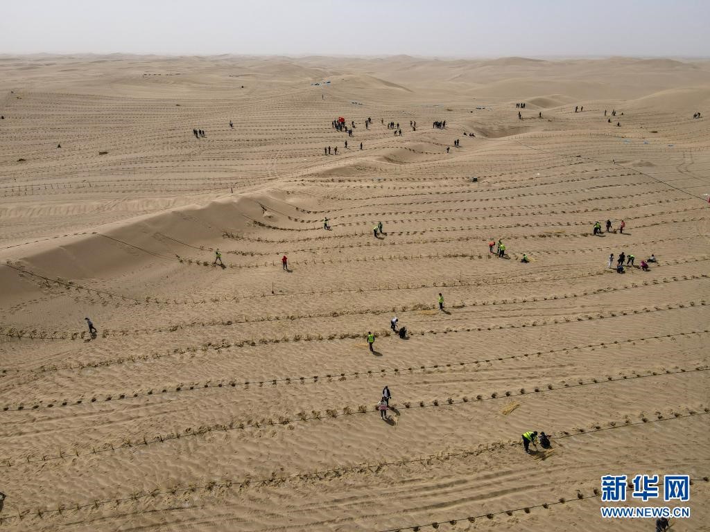 人們?cè)诰嚯x新疆且末縣城不遠(yuǎn)處的塔克拉瑪干沙漠內(nèi)植樹(shù)(3月28日攝,無(wú)人機(jī)照片)。新華社記者 高晗 攝