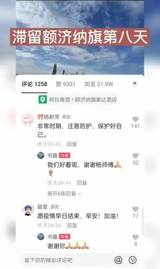 視頻發(fā)出數(shù)小時(shí)就吸引了上萬(wàn)的瀏覽量。視頻發(fā)布者王女士在視頻中呈現(xiàn)一家人滯留額濟(jì)納旗現(xiàn)況的同時(shí),也給和她同樣滯留額濟(jì)納旗的近萬(wàn)名游客鼓勁:“如果你此時(shí)正在阿拉善,愿你如胡楊般堅(jiān)強(qiáng),積極應(yīng)對(duì)疫情?!?/p>