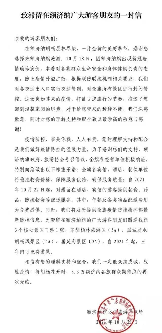 這封公開(kāi)信中寫(xiě)道,自10月22日起,對(duì)滯留在酒店、賓館的游客提供餐食、藥品、防控物資等配送服務(wù),其中,午餐及各類(lèi)物品配送費(fèi)用為免費(fèi)提供;為滯留游客贈(zèng)送胡楊林旅游區(qū)(5A)、黑城弱水胡楊風(fēng)景區(qū)(4A)、居延海景區(qū)(3A)3個(gè)核心景區(qū)門(mén)票1張,自2021年起,三年內(nèi)可免費(fèi)游覽。