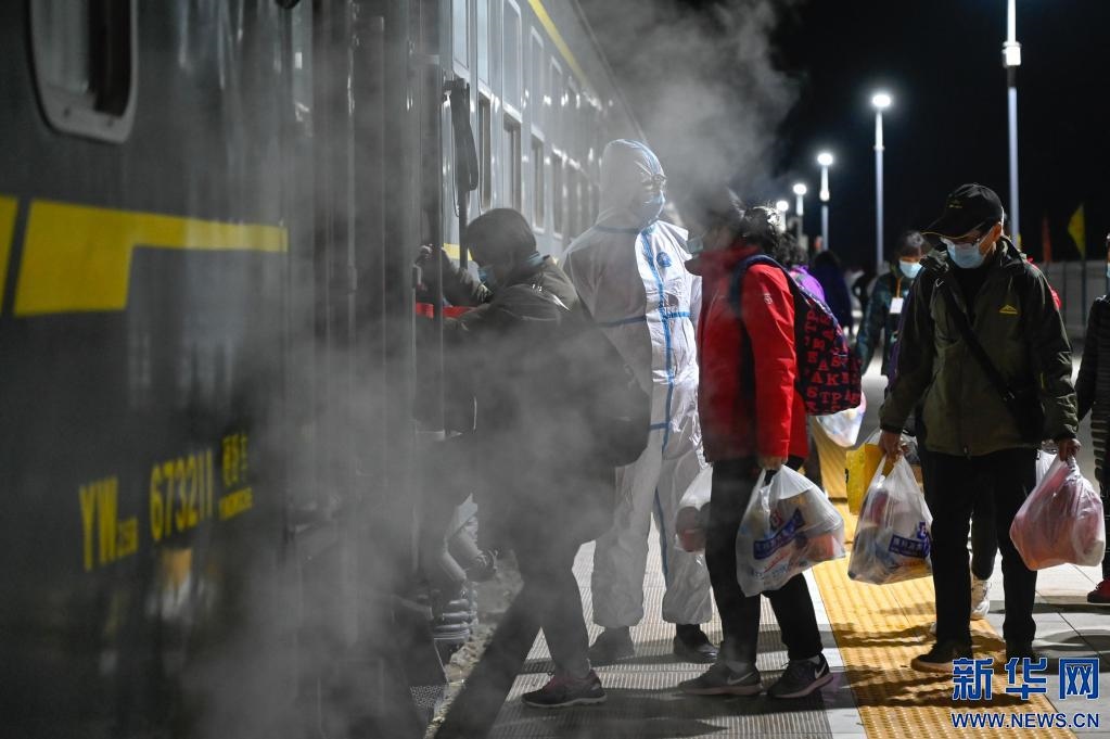 10月27日,滯留游客登上返程列車。新華社記者 賀書琛 攝