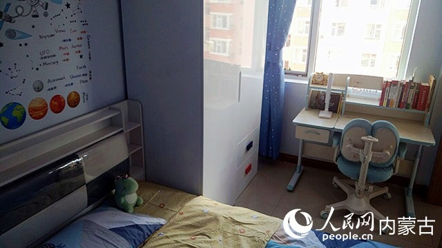 在對原有住房進行規(guī)劃、設(shè)計后,施工隊開始裝修,并配備必要的家具、臥具和學習生活用品。歷時半個多月,一間以藍色為主色調(diào)的小屋建成了?,F(xiàn)在,屬于浩博的那一半臥室,泛黃的臥室墻壁被粉刷成淡藍色,換了新的小床和衣柜,新添置的書桌上擺滿了課外書,看起來整潔又溫馨。