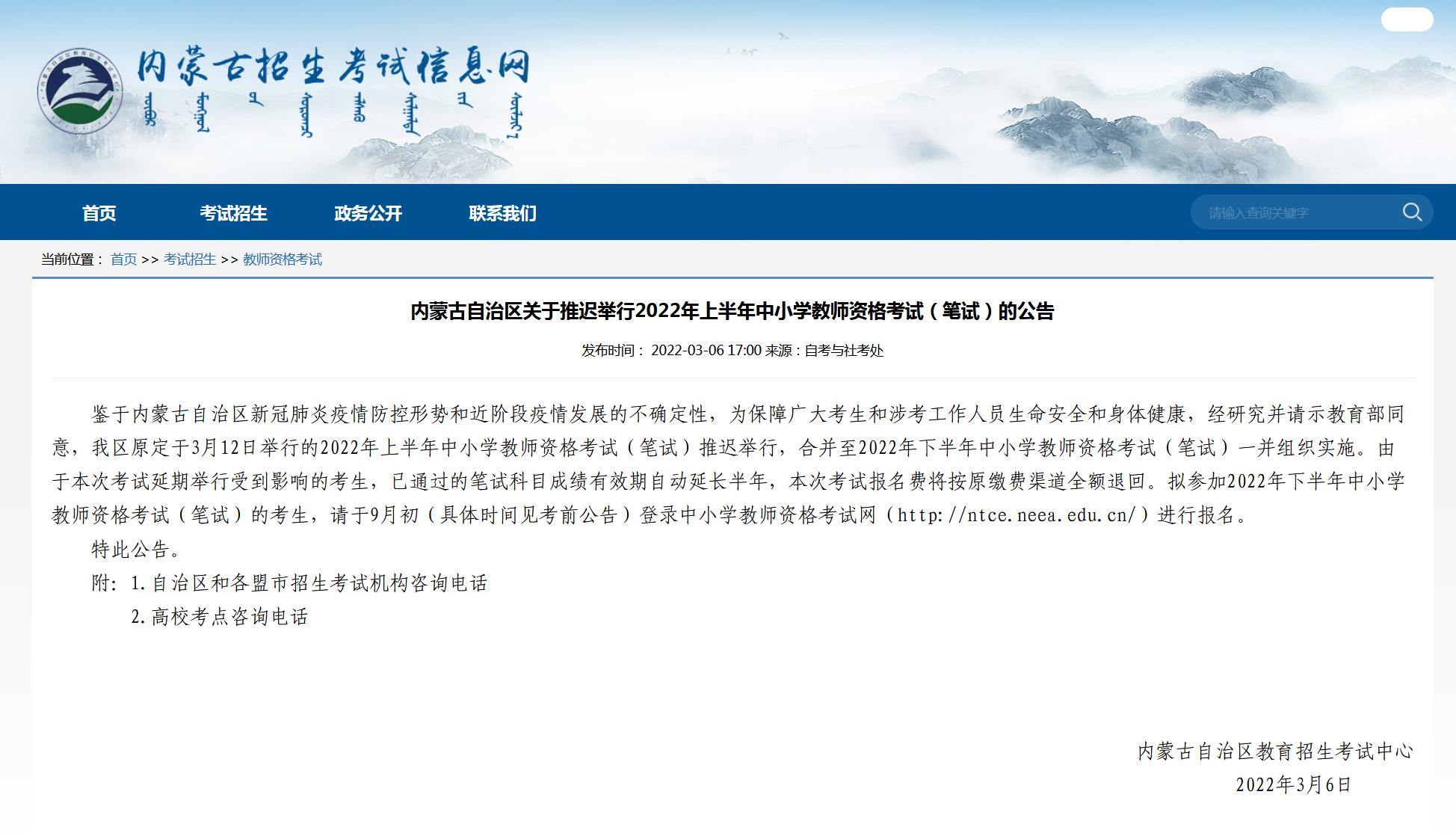 內(nèi)蒙古推遲舉行2022年上半年中小學(xué)教師資格考試筆試