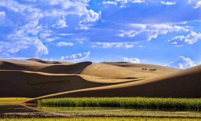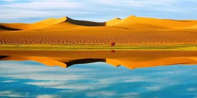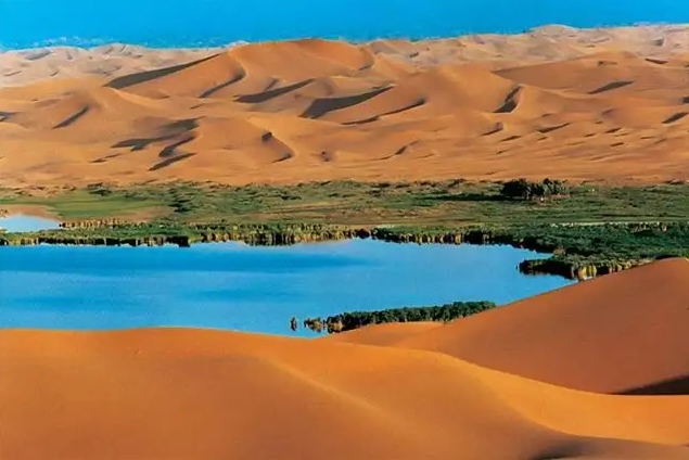 巴丹吉林沙漠年降水量不足40毫米,但是沙漠中的湖泊竟然多達(dá)100多個。高聳入云的沙山,神秘莫測的鳴沙,靜謐的湖泊、濕地,構(gòu)成了巴丹吉林沙漠獨(dú)特的迷人景觀,于2005年被《中國國家地理》雜志評為中國最美麗的沙漠,每年吸引了上萬名國內(nèi)外游客前來觀光。