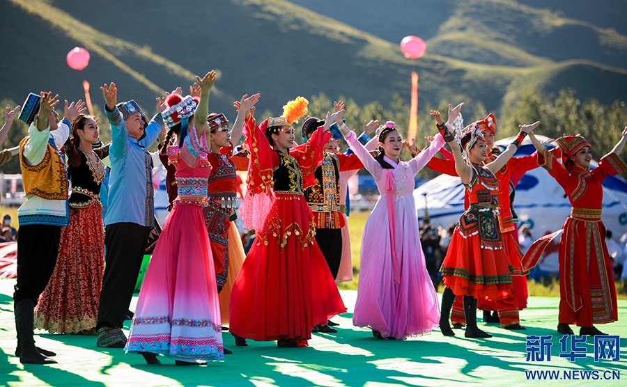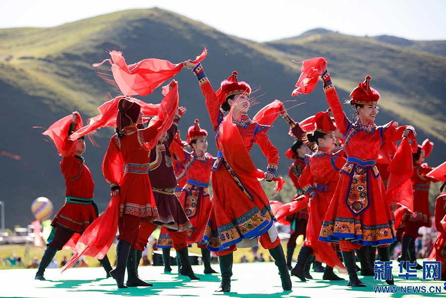 8月8日,烏蘭牧騎的隊員在開幕式上踏歌起舞。新華網(wǎng)發(fā)(丁根厚攝)