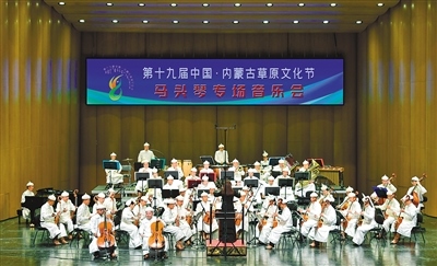 在第十九屆中國(guó)·內(nèi)蒙古草原文化節(jié)馬頭琴專場(chǎng)音樂(lè)會(huì)上,中國(guó)烏審馬頭琴交響樂(lè)團(tuán)演奏《草原歡歌》。音樂(lè)會(huì)分為上半場(chǎng)和下半場(chǎng),分別由烏審馬頭琴交響樂(lè)團(tuán)和齊·寶力高野馬馬頭琴樂(lè)團(tuán)演奏,為觀眾開(kāi)啟氣勢(shì)磅礴富有草原文化特色的音樂(lè)之旅。記者 王磊 攝