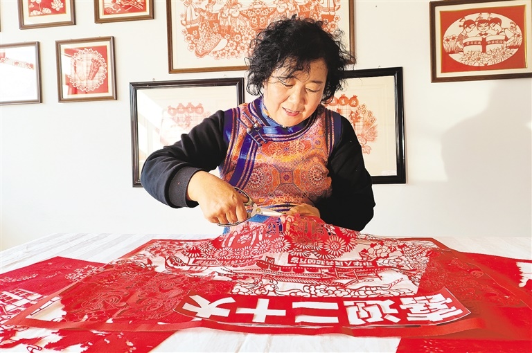 10月15日下午,自治區(qū)非遺剪紙項(xiàng)目傳承人、呼和浩特市土默特左旗畢克齊鎮(zhèn)紅秀剪紙合作社發(fā)起人李還秀在創(chuàng)作慶祝黨的二十大勝利召開(kāi)系列剪紙作品。連日來(lái),全區(qū)各地群眾通過(guò)剪紙、書法等藝術(shù)形式,表達(dá)對(duì)盛會(huì)的期盼、對(duì)祖國(guó)的祝福。記者 鄭學(xué)良 實(shí)習(xí)生 郭亞麗 攝