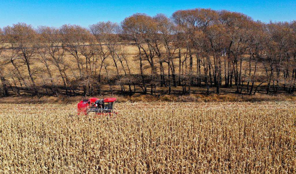 10月18日,這是通遼市奈曼旗新鎮(zhèn)正在收獲的玉米地。(無人機(jī)照片 新華社記者 連振 攝)