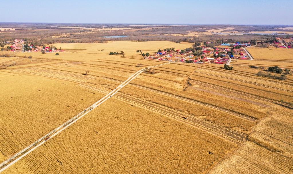 10月13日,這是通遼市奈曼旗義隆永鎮(zhèn)方家營子村待收的玉米。(無人機(jī)照片 新華社記者連振 攝)