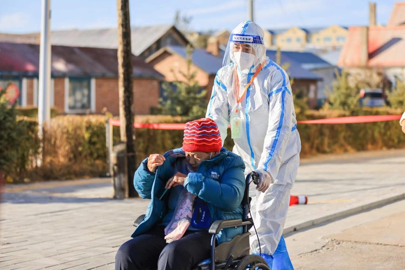 圖①額爾古納市檢察院干警幫助行動(dòng)不便老人做核酸檢測(cè)。
