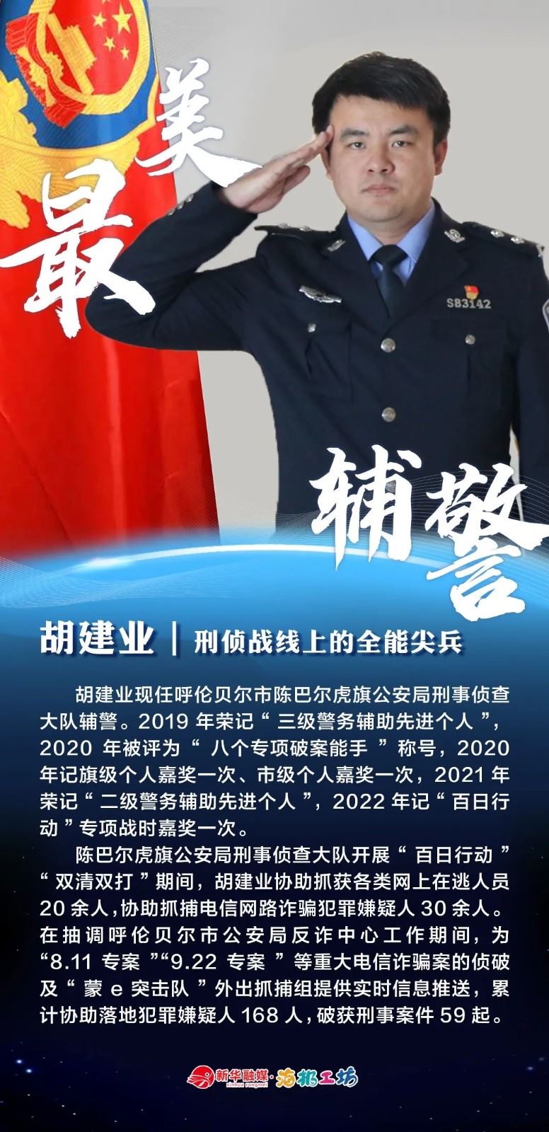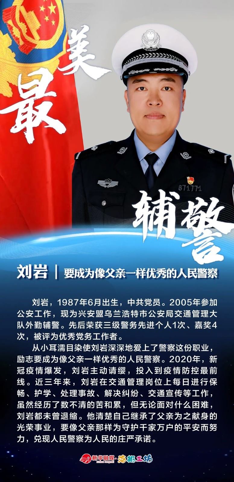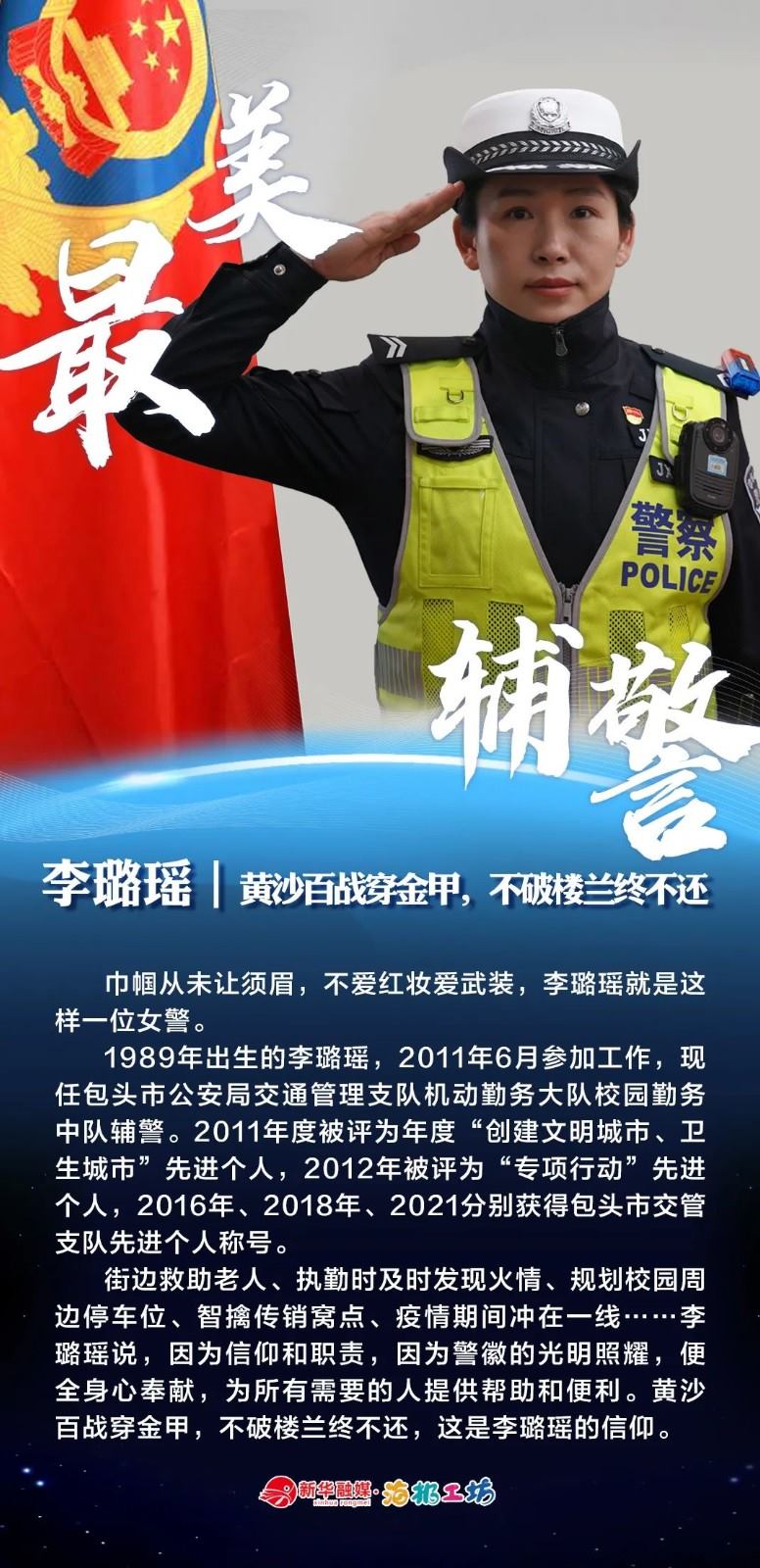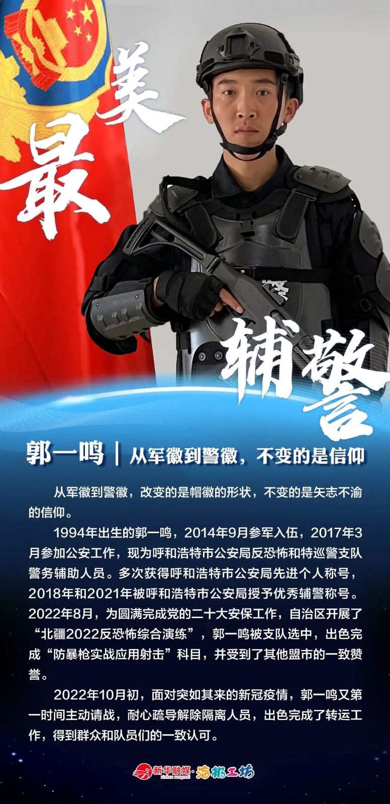 “不同的肩章,同樣的堅守……”在“感動北疆·最美輔警”獲獎?wù)咧校?strong>有堅守忠誠的安全衛(wèi)士郭一鳴,對癥下藥的老片兒警康華,服務(wù)群眾的熱心人辛永紅,校園安全的“護航員”李璐瑤,社區(qū)警務(wù)“信息化管家”鄭威,警務(wù)支撐“小能手”胡建業(yè),110接處警“活地圖”劉順峰,網(wǎng)上巡查“質(zhì)檢員”王昊,基層交通安全“好聲音”劉巖,一線“智慧公安”排頭兵張?zhí)睢?/strong>
