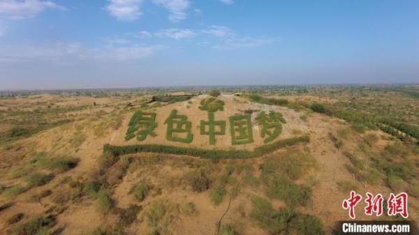 圖為寫有“綠色中國(guó)夢(mèng)”字樣的庫布其沙漠。 張博供圖