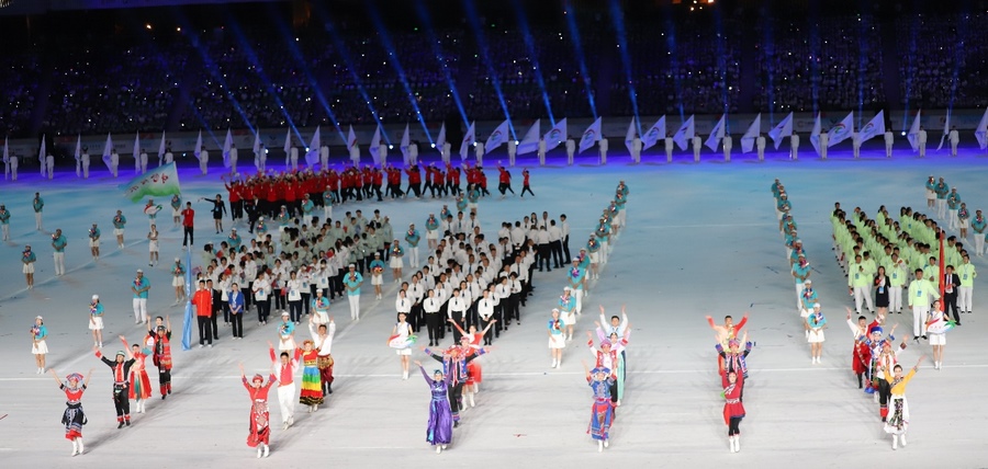 開幕式現(xiàn)場座無虛席,萬眾矚目下儀仗隊(duì)護(hù)送五星紅旗步入會(huì)場,國旗莊嚴(yán),腳步鏗鏘,一種豪邁和驕傲激蕩在每個(gè)人的心里。