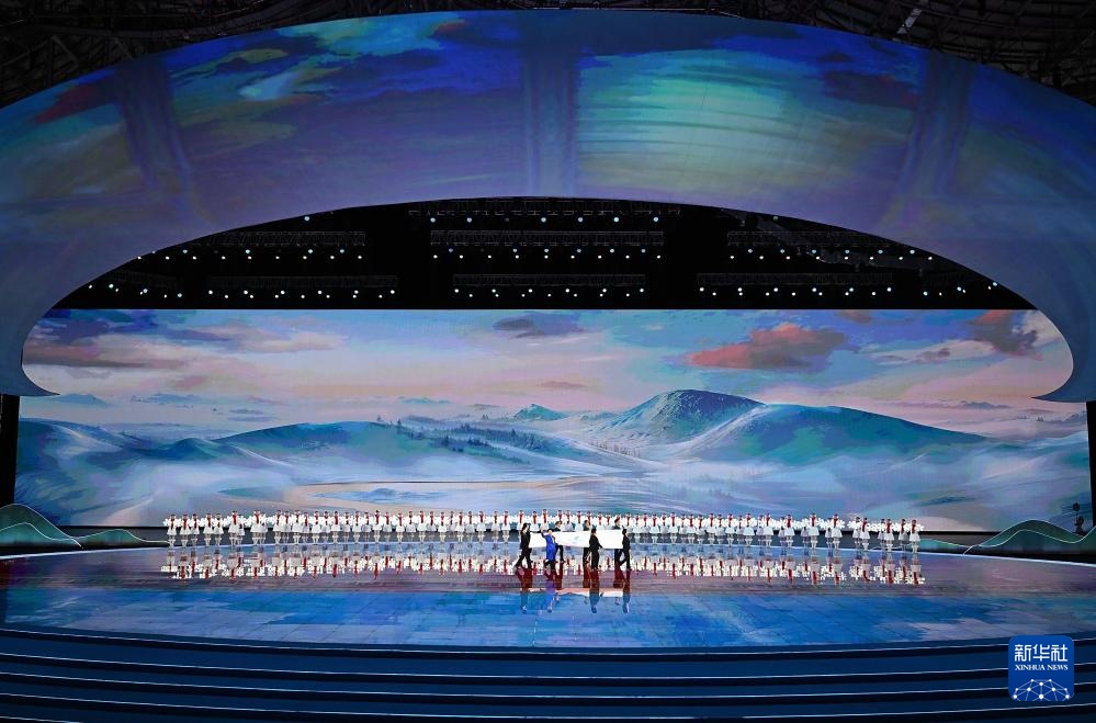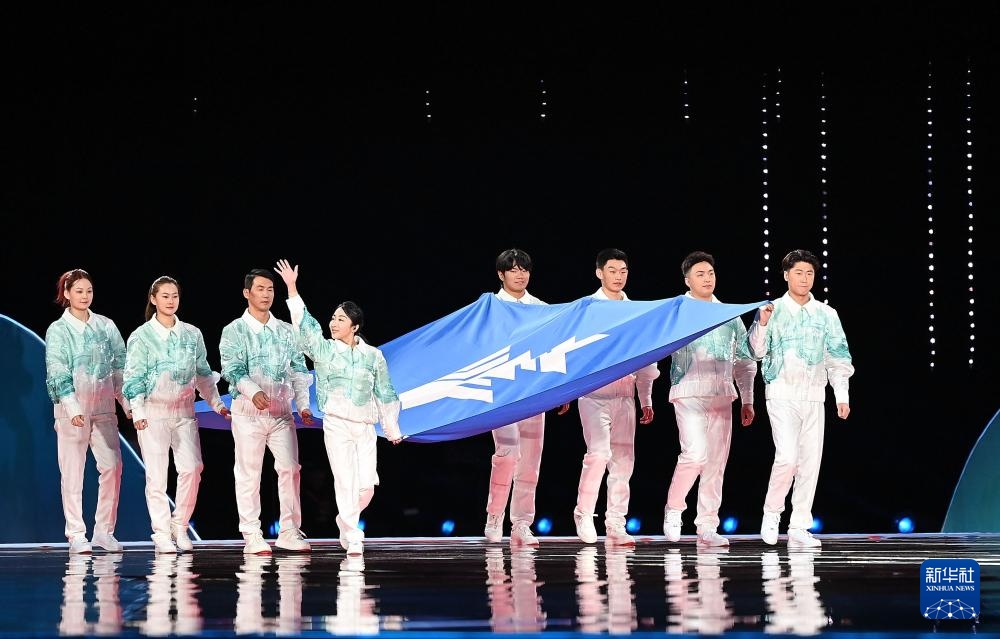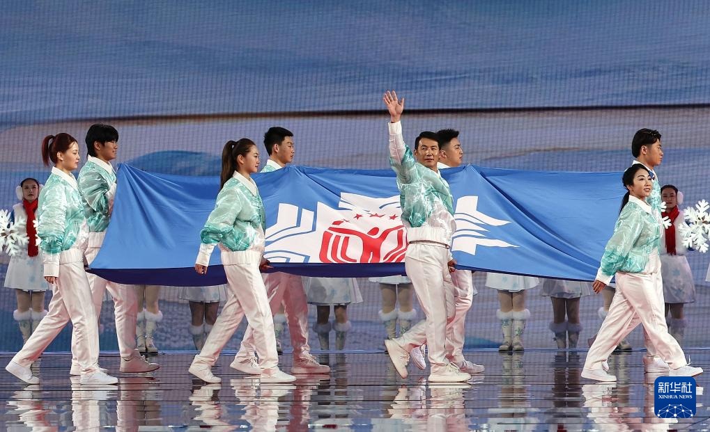 ??2月17日,中華人民共和國(guó)第十四屆冬季運(yùn)動(dòng)會(huì)會(huì)旗在開幕式上入場(chǎng)。新華社記者 黃偉 攝
