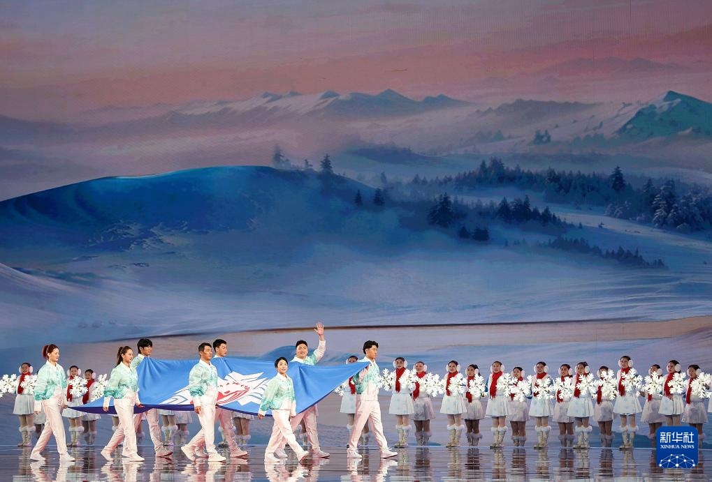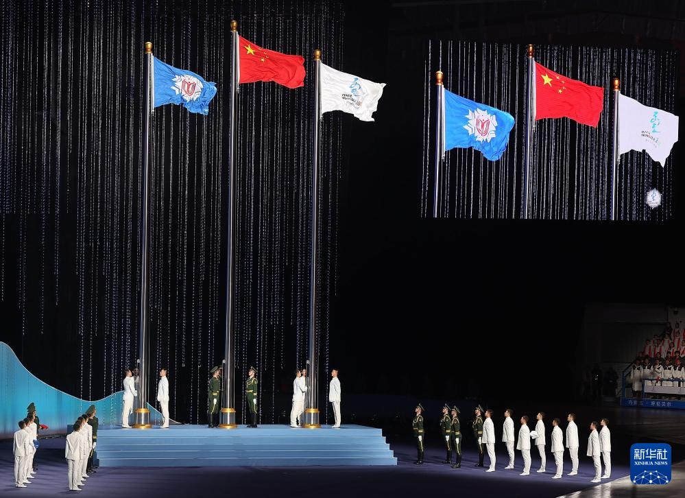??2月17日,中華人民共和國(guó)第十四屆冬季運(yùn)動(dòng)會(huì)會(huì)旗在開幕式上入場(chǎng)。新華社記者 楊晨光 攝